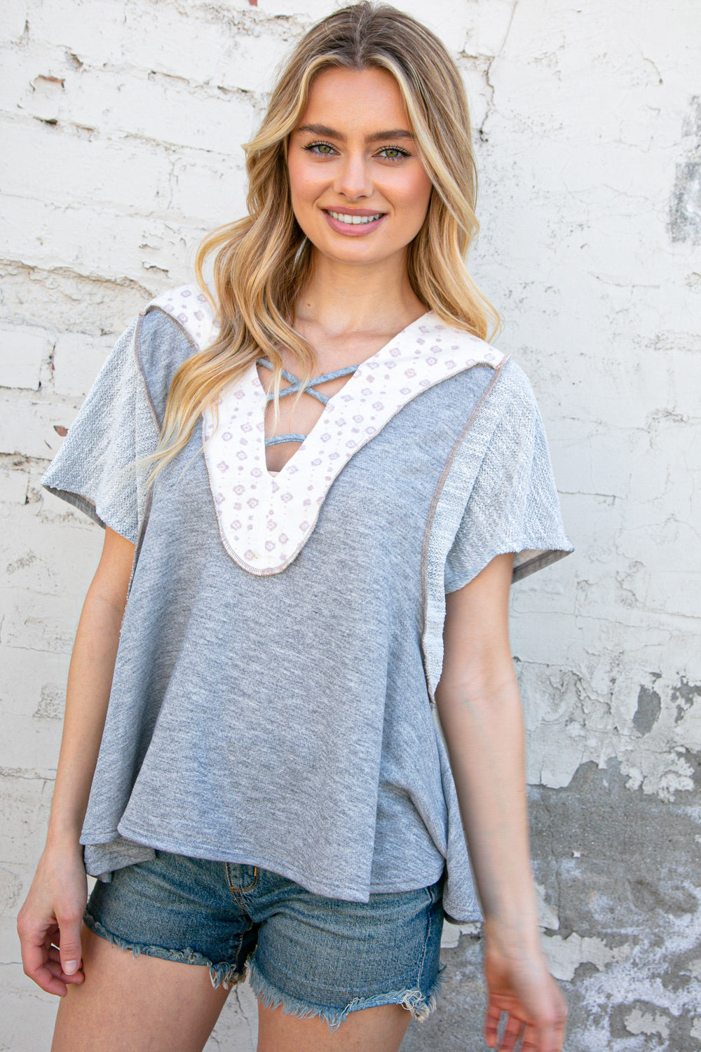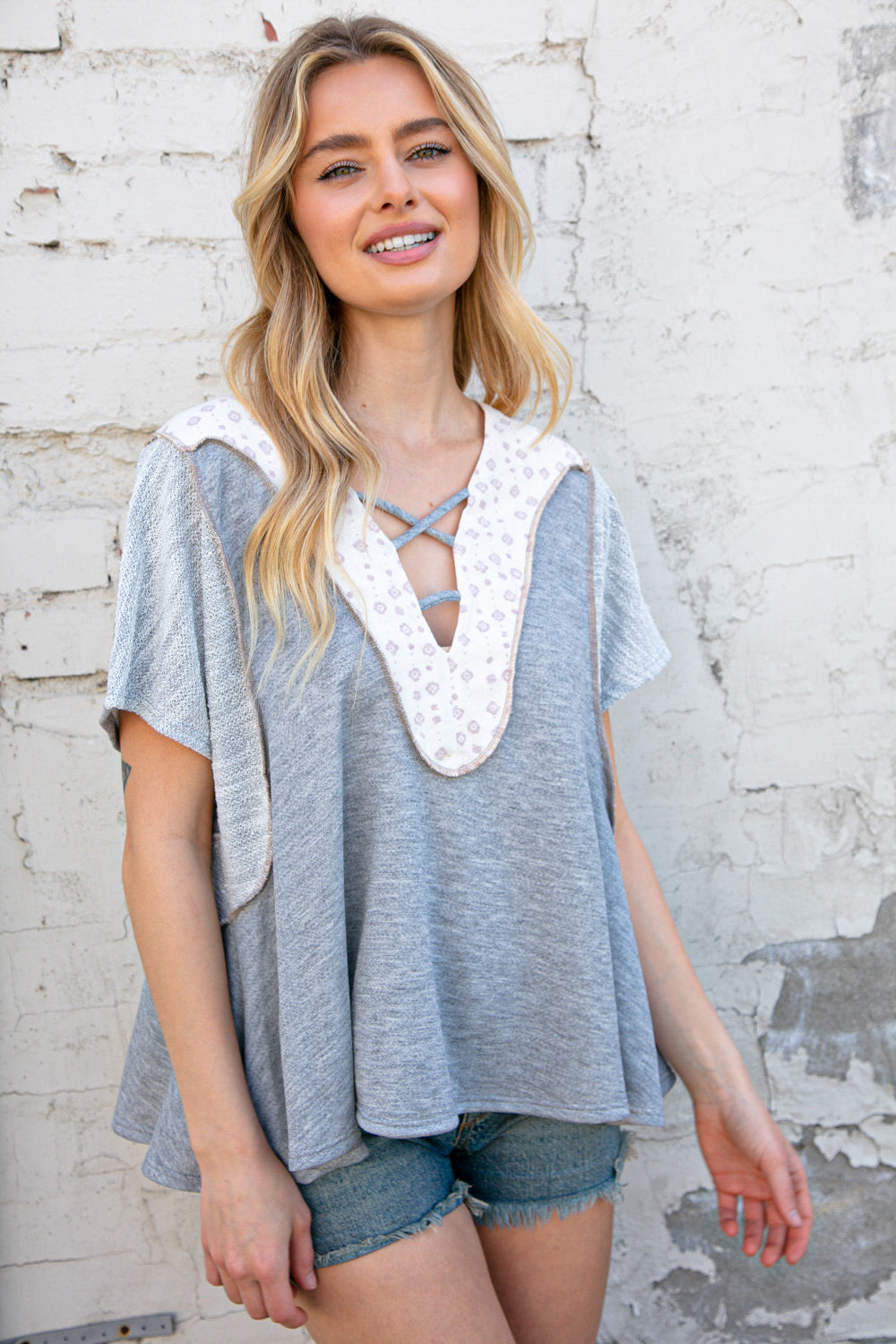 Boho Print Terry Cotton Triblend Color Block Crisscross Top