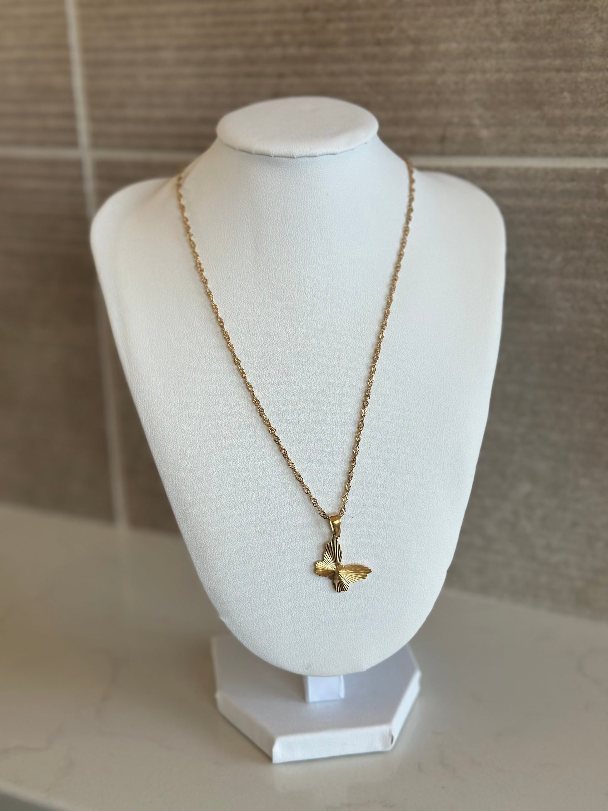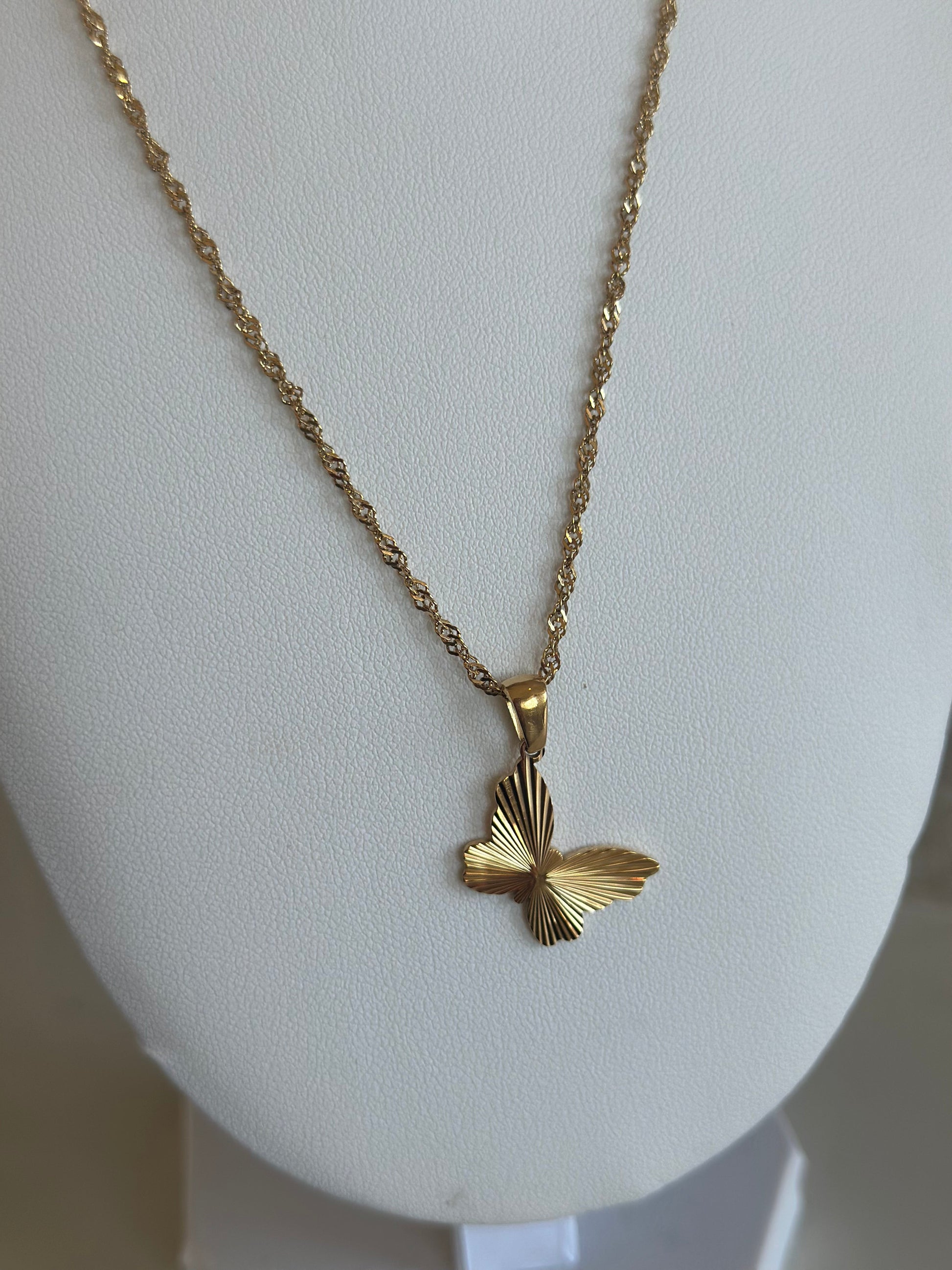 Flutter into style with this Butterfly 18k Gold Plated Necklace, a delicate and whimsical piece that captures the beauty of nature's most enchanting creatures. The necklace features a finely crafted butterfly pendant plated in luxurious 18k gold, adding a touch of elegance and charm to your ensemble. Whether worn alone as a statement piece or layered with other necklaces for a personalized look, the Butterfly Necklace is sure to draw attention with its intricate details and graceful design. Perfect for nature lovers or anyone who appreciates delicate jewelry, this 18k Gold Plated Butterfly Necklace is a timeless accessory that brings a touch of magic to any outfit!