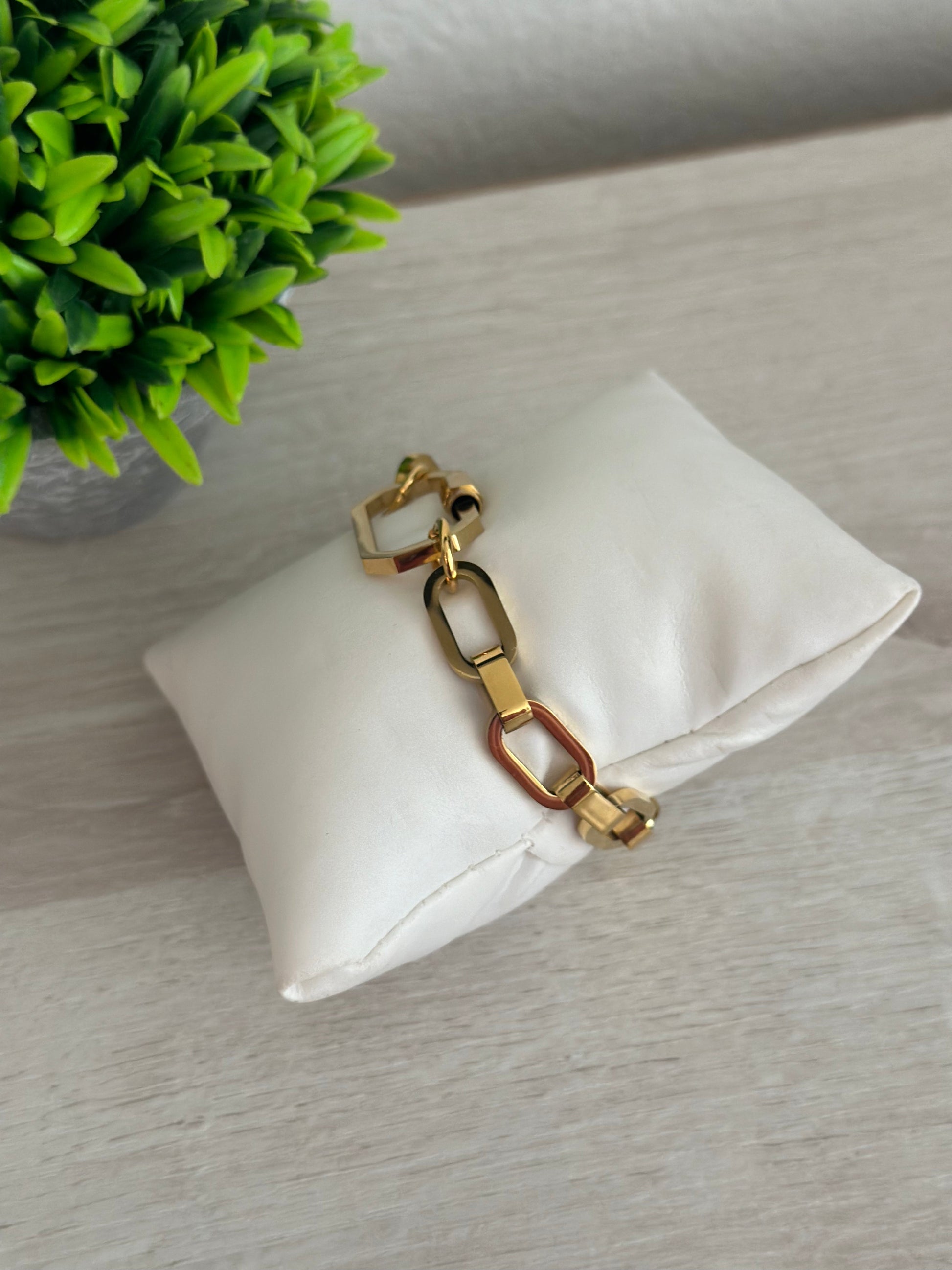 Embrace a bold and modern look with this Carabiner Chunky Link Bracelet, a statement piece that exudes contemporary style and edgy sophistication. The bracelet features oversized, chunky links crafted with meticulous attention to detail, creating a striking and robust design. At the center of the bracelet, a sleek carabiner clasp adds a unique and functional touch, combining utility with fashion. Whether worn solo for a standout look or paired with other bracelets for a layered aesthetic, the Carabiner Chunky Link Bracelet is a versatile accessory that adds a touch of urban flair to any outfit.