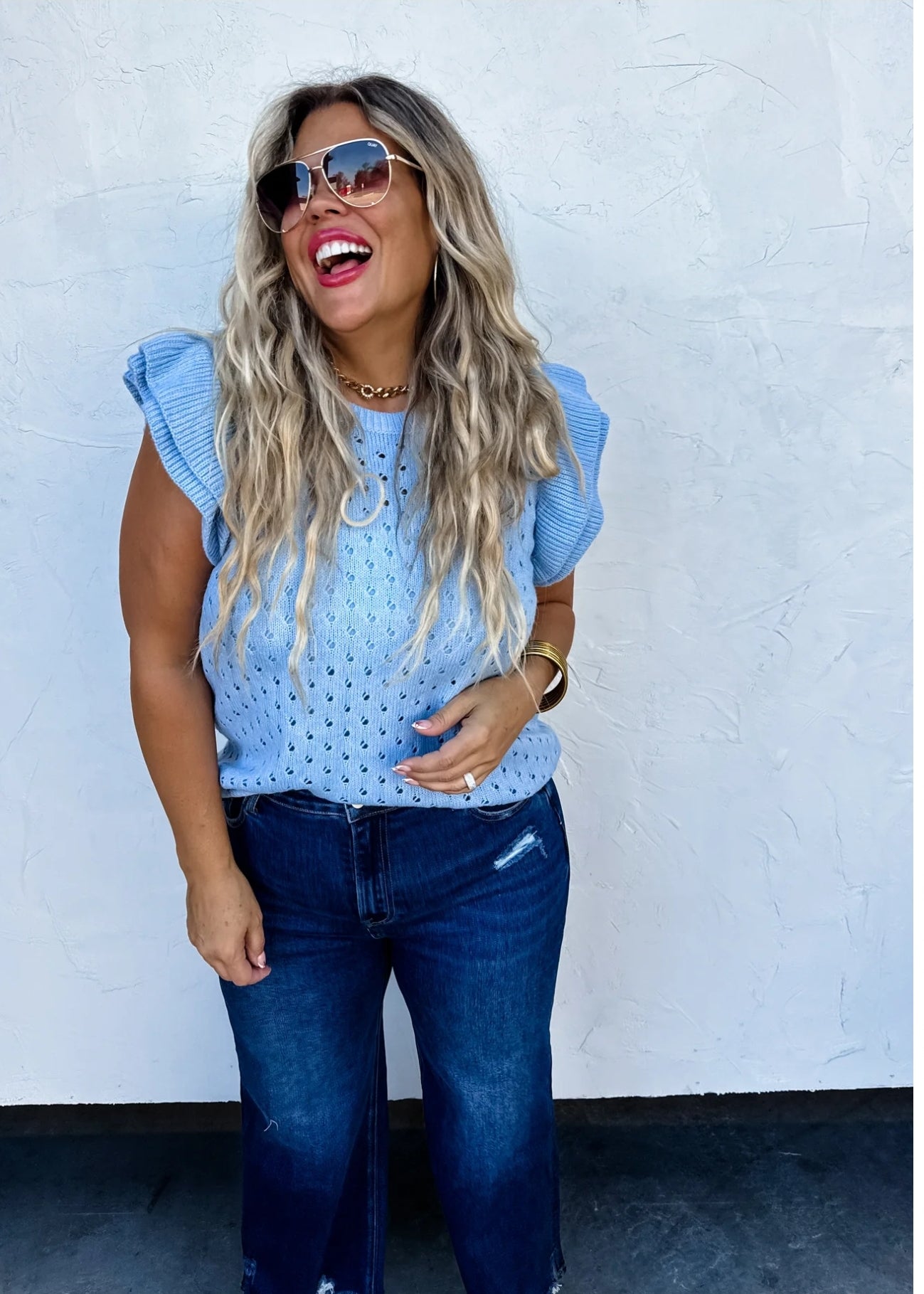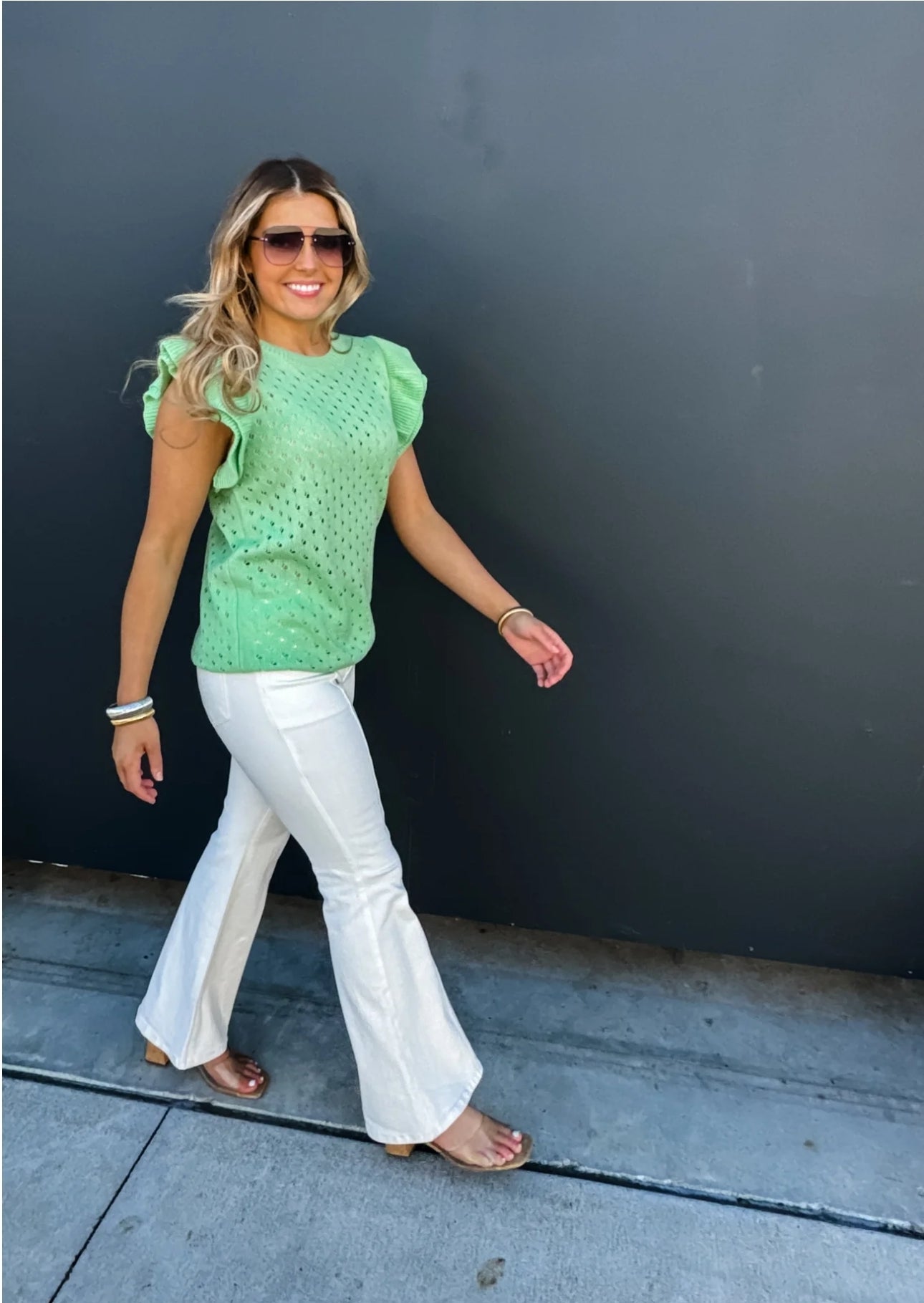 The cutest little Spring transition, ruffle sleeve sweater! Such a feminine look that compliments jeans, pants or shorts!