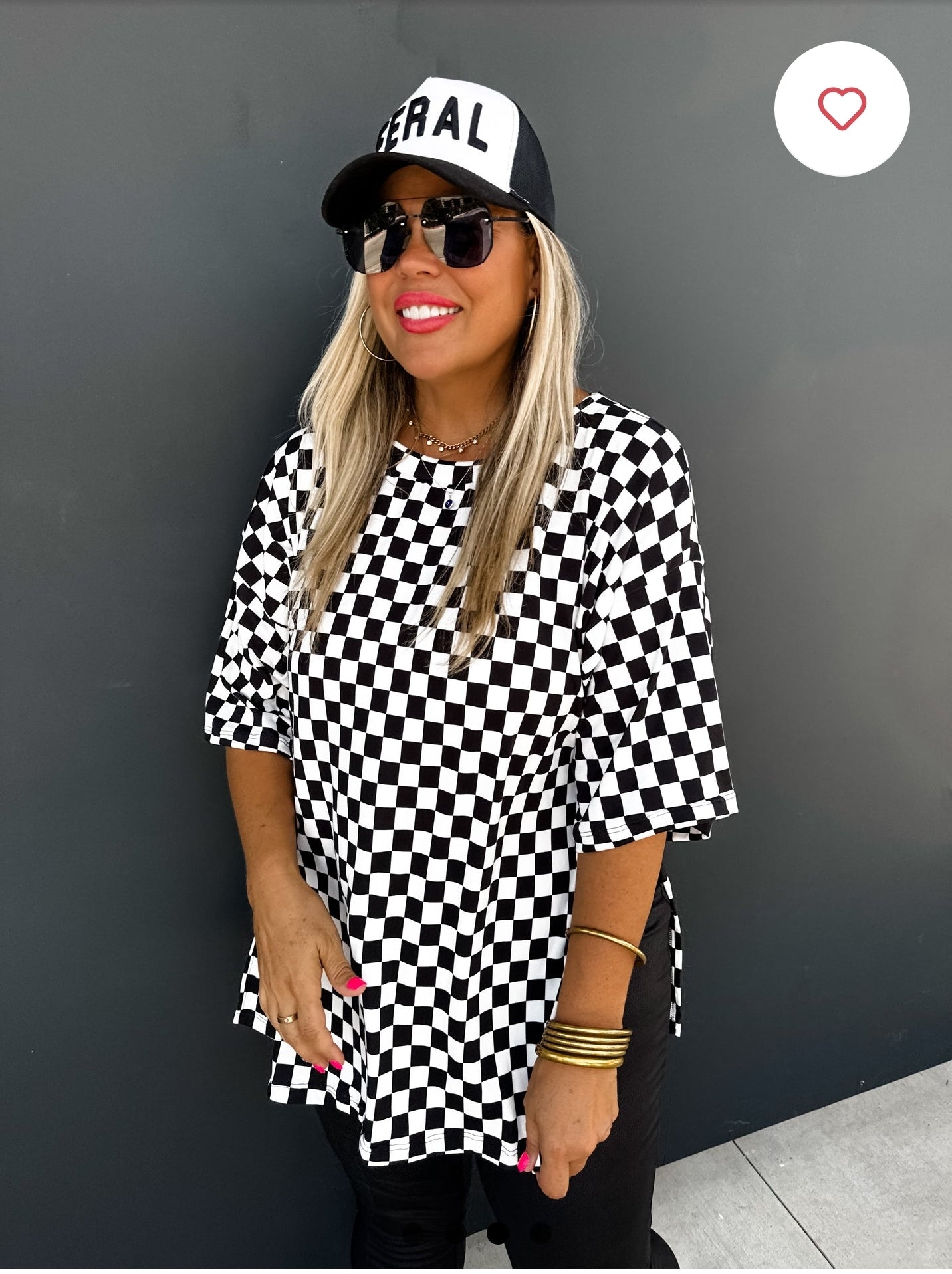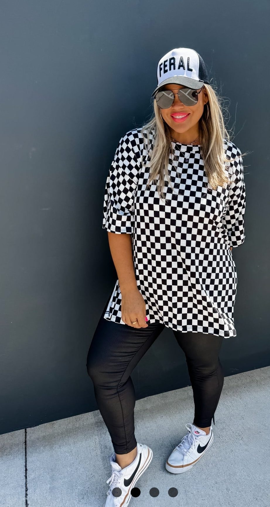 This bold checker top features an oversized fit with side slits. Matches perfectly with our bold block checker pants. Wear it as a set or alone with leggings or biker shorts! The perfect way to add a "pop" to any outfit!