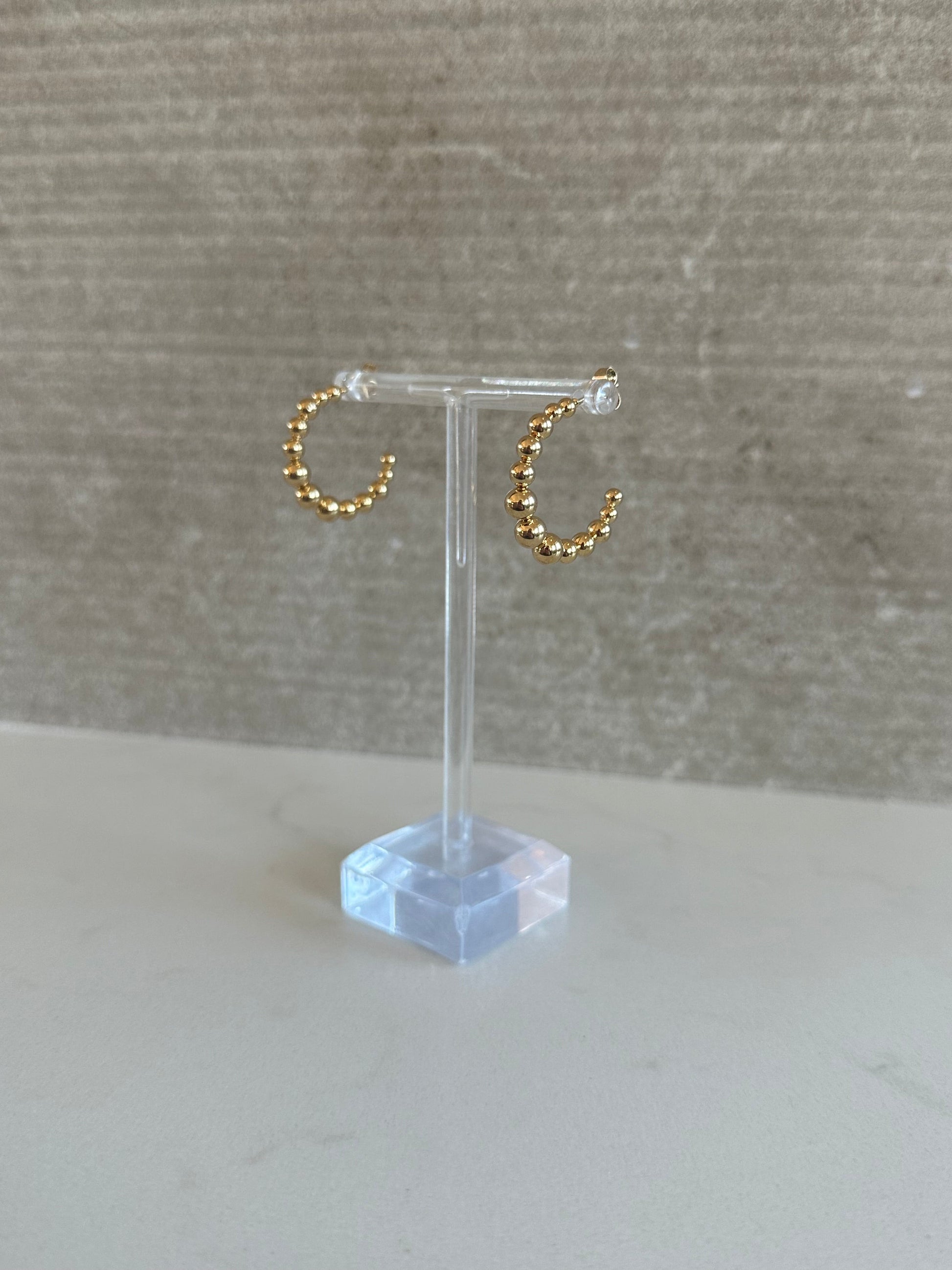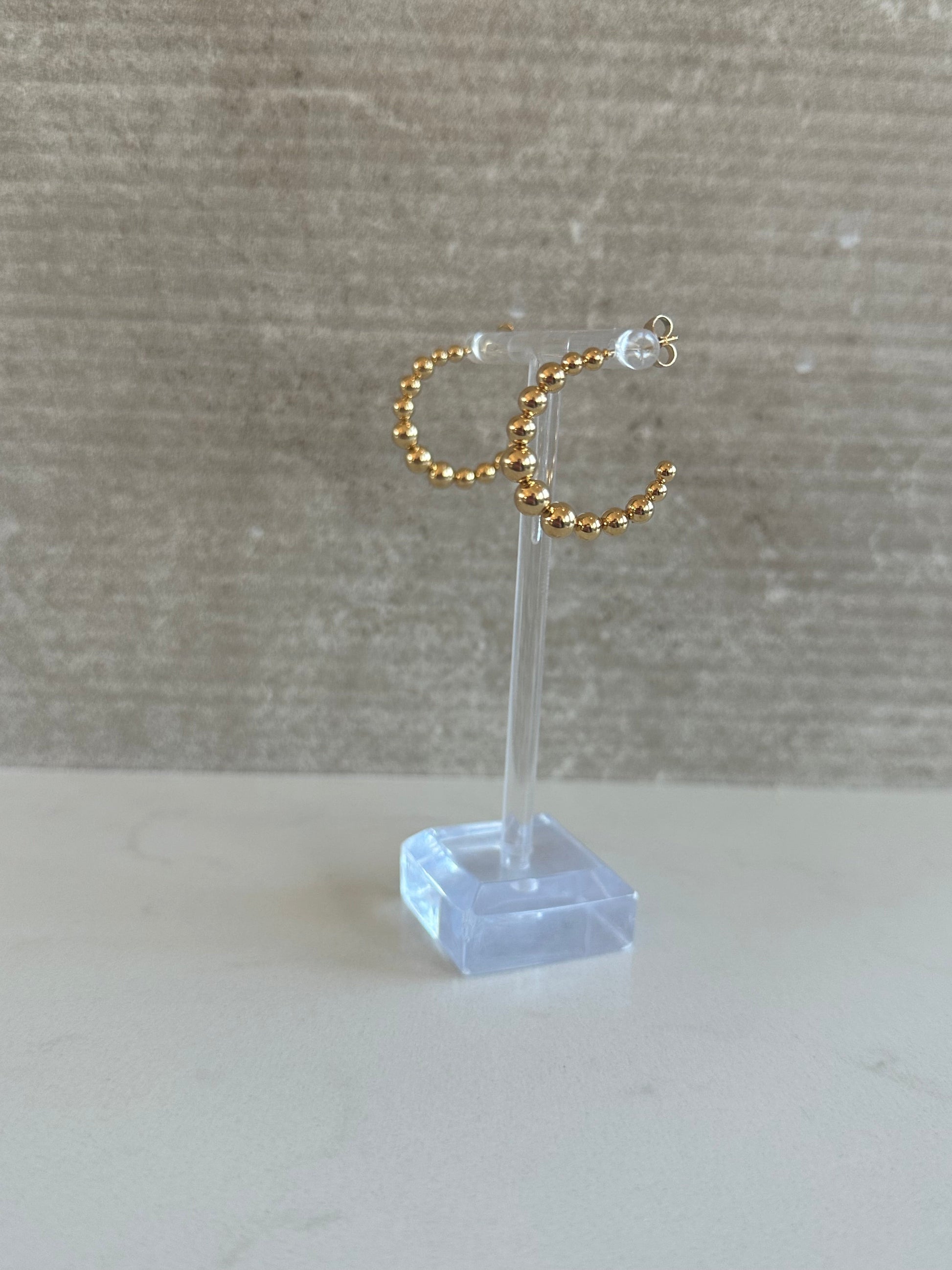 Elevate your earring game with these Gold Bead Hoops featuring a secure post closure, combining style and comfort effortlessly. The sleek hoop design is accentuated by delicate gold beads, adding a touch of elegance and sophistication to your look. With their convenient post closure, these hoops offer easy wearability while ensuring a secure fit. Whether you're dressing up for a night out or adding a touch of glamour to your everyday ensemble, these Gold Bead Hoops with Post Closure are a versatile and stylish accessory that complements any outfit with timeless charm.