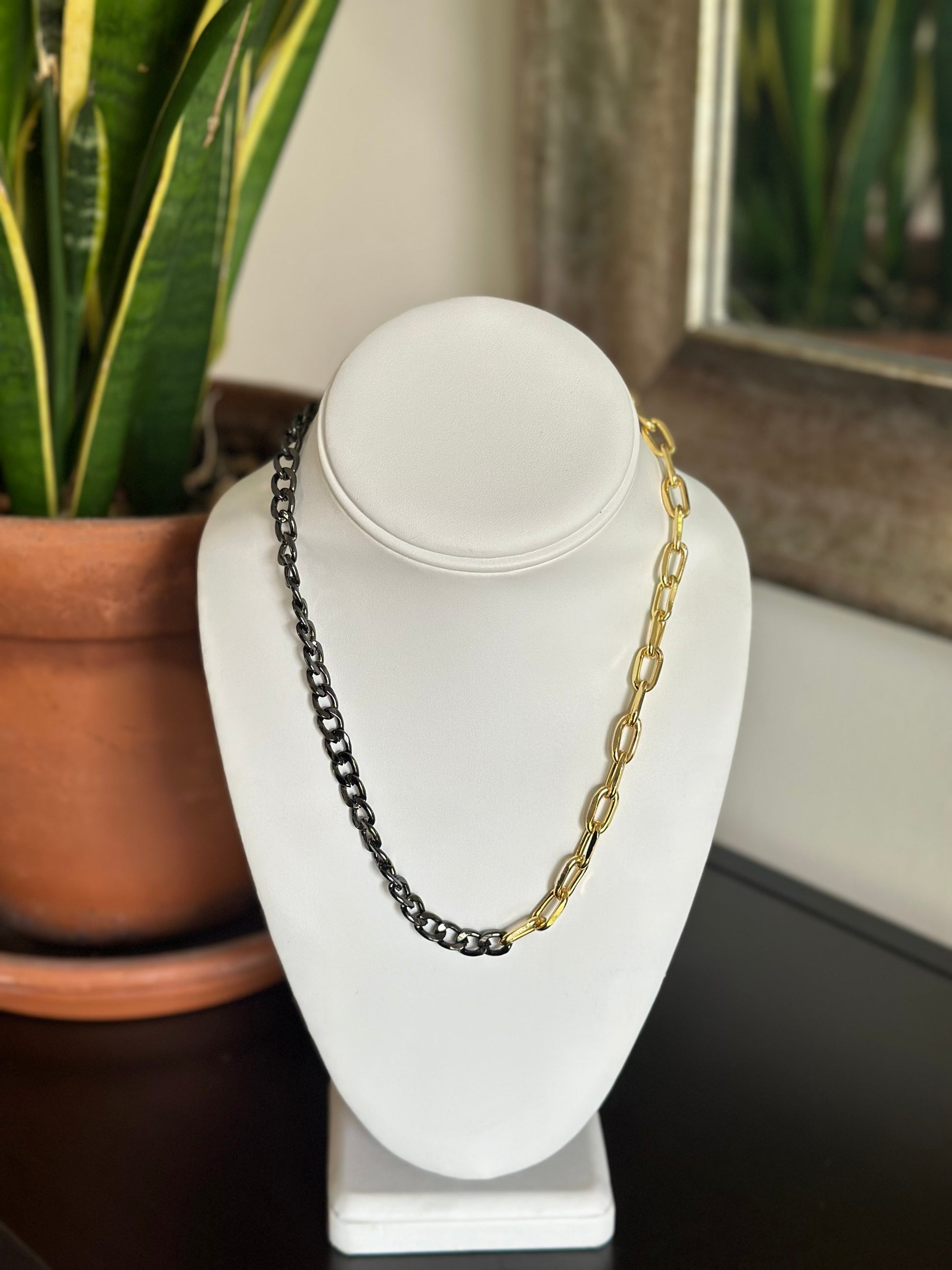 Make a bold statement with this Black and Gold Chunky Chain Link Necklace, a striking piece that exudes contemporary glamour. The necklace features chunky chain links in a mix of black and gold tones, creating a contrast that is both edgy and sophisticated. The substantial size of the links adds a dramatic flair to the necklace, making it a standout accessory for any outfit. Whether you're dressing up a simple tee or adding the finishing touch to a night-out ensemble, this Black and Gold Chunky Chain Link Necklace is sure to turn heads and elevate your style with its bold and chic design.