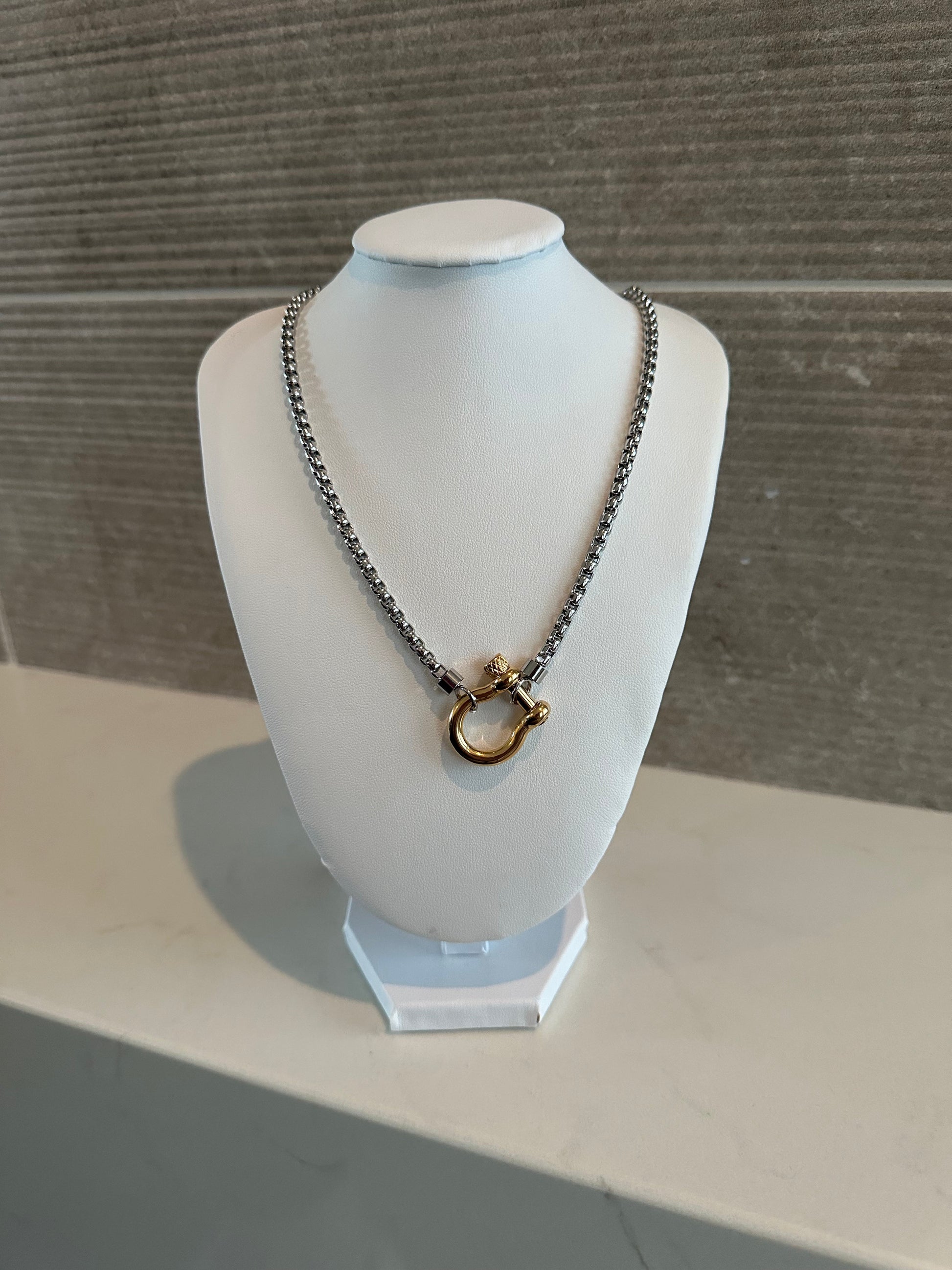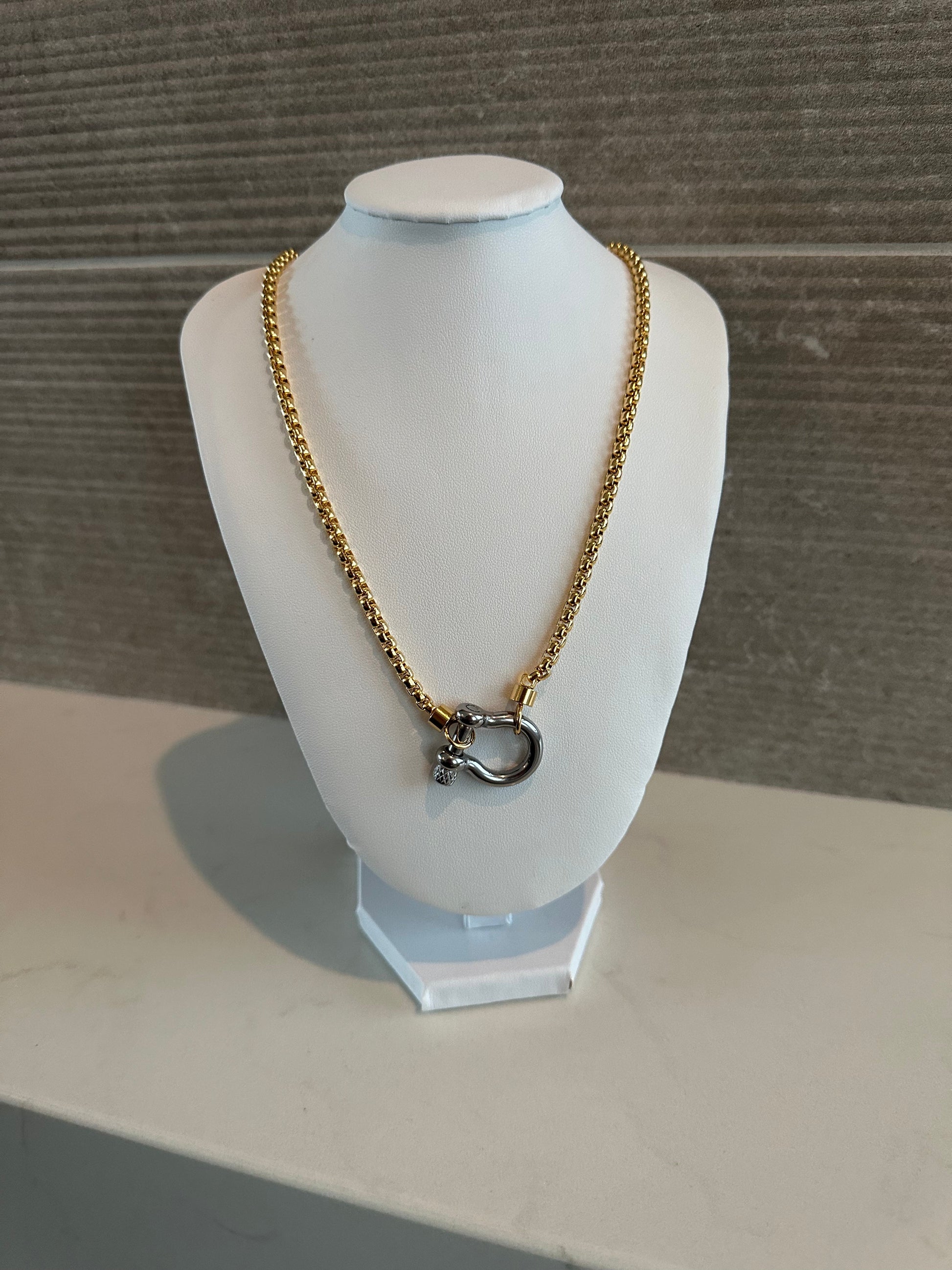 Make a bold style statement with this Chunky Box Chain Necklace featuring a Horsebit Closure in 18k Gold, a luxurious piece that combines classic elegance with modern edge. The necklace showcases a chunky box chain crafted with precision and attention to detail, creating a substantial and eye-catching design. At the front, a distinctive horsebit closure plated in 18k gold adds a touch of equestrian-inspired charm and serves as a unique focal point. Whether worn solo to make a statement or layered with other necklaces for a personalized look, this Chunky Box Chain Necklace with Horsebit Closure is a versatile accessory that adds a touch of sophistication and glamour to any outfit.