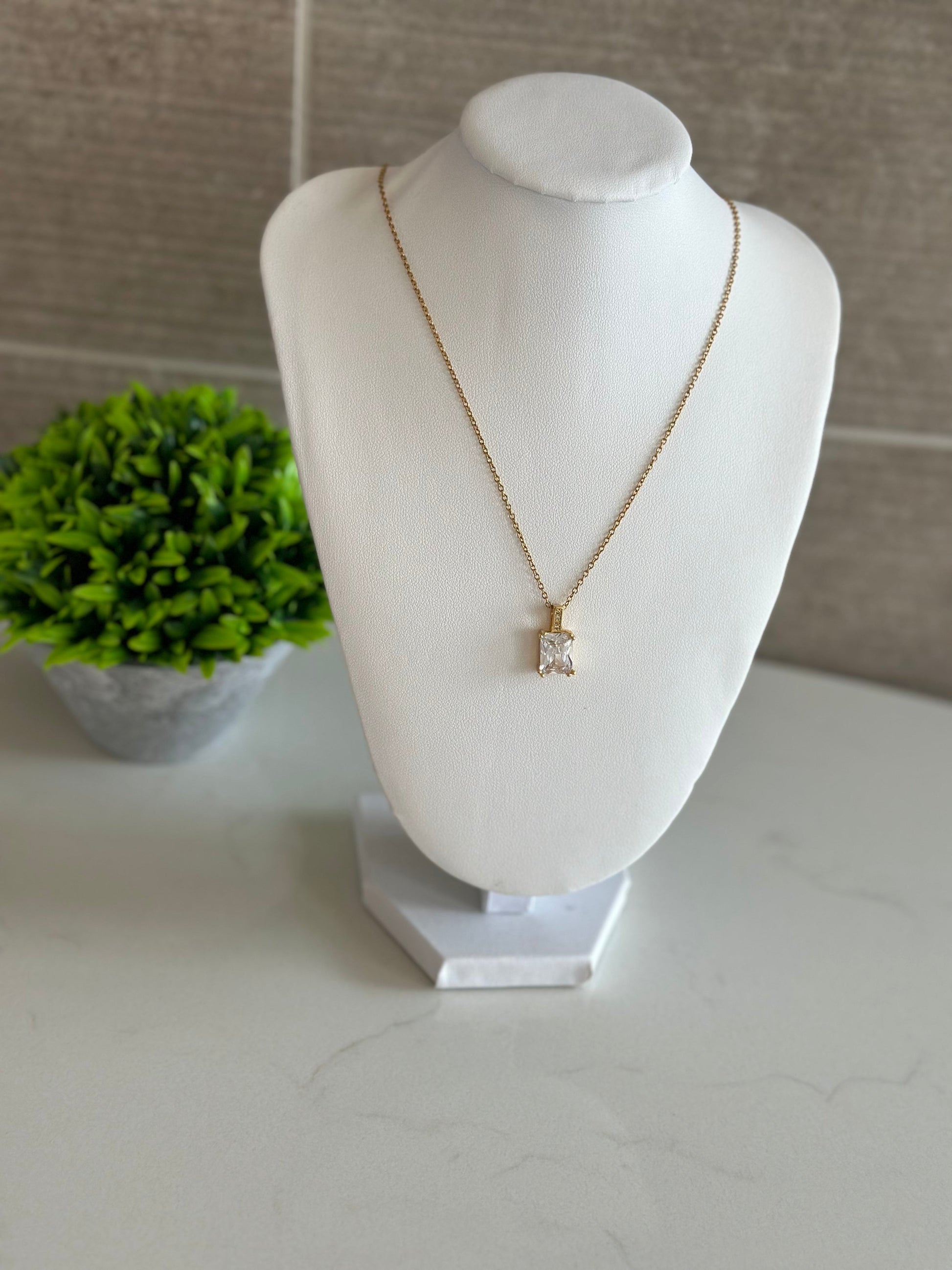 Elevate your look with our Emerald Cut CZ Drop Necklace, a dazzling piece that exudes timeless elegance and sparkle. This necklace features a stunning emerald-cut cubic zirconia stone, meticulously crafted to mimic the clarity and brilliance of a genuine emerald. The stone is beautifully suspended from a delicate chain, creating a graceful drop that adds a touch of sophistication to any ensemble.