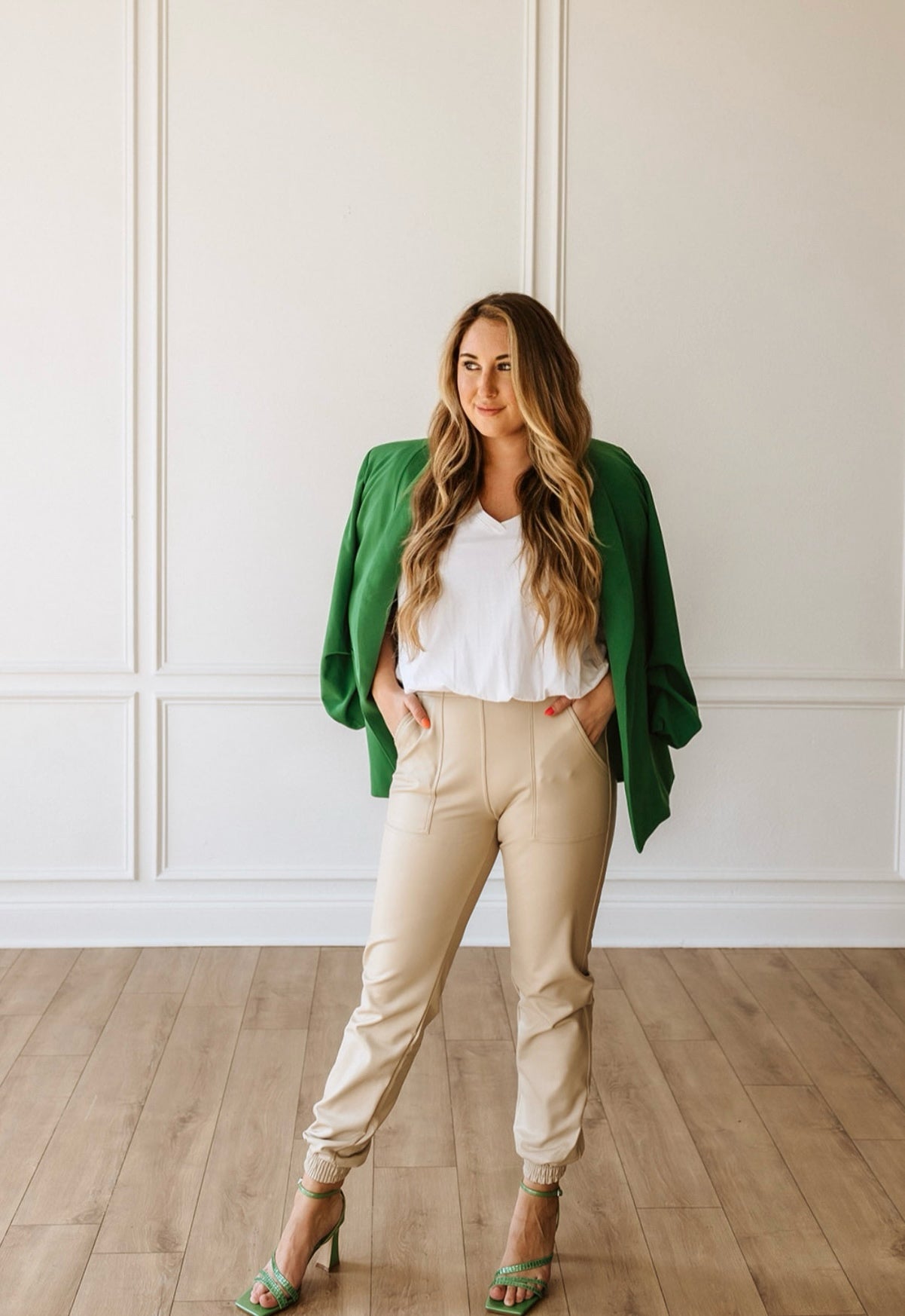 Introducing our Stretch Vegan Leather Joggers, a sleek and stylish addition to your wardrobe.