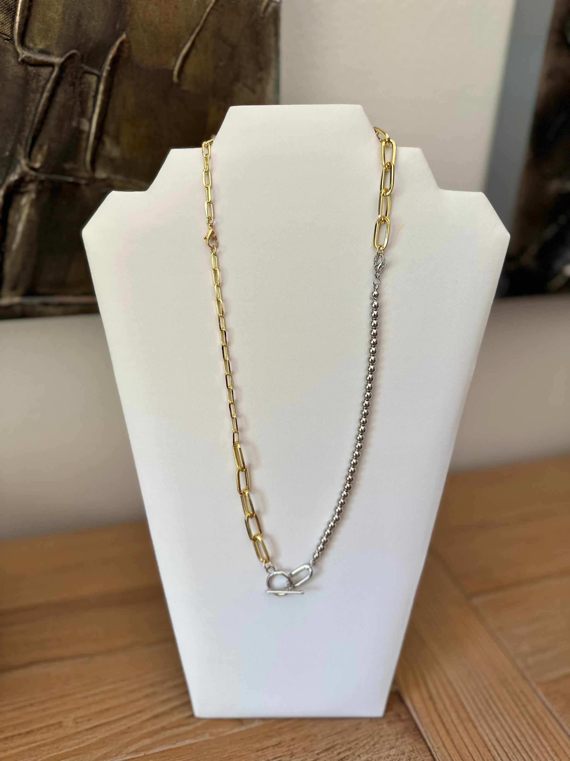 Introducing our Mixed Toggle Necklace, a chic and contemporary accessory that adds a touch of modern flair to any outfit. This necklace features a combination of mixed metal links, including gold and silver tones, creating a stylish and versatile look.