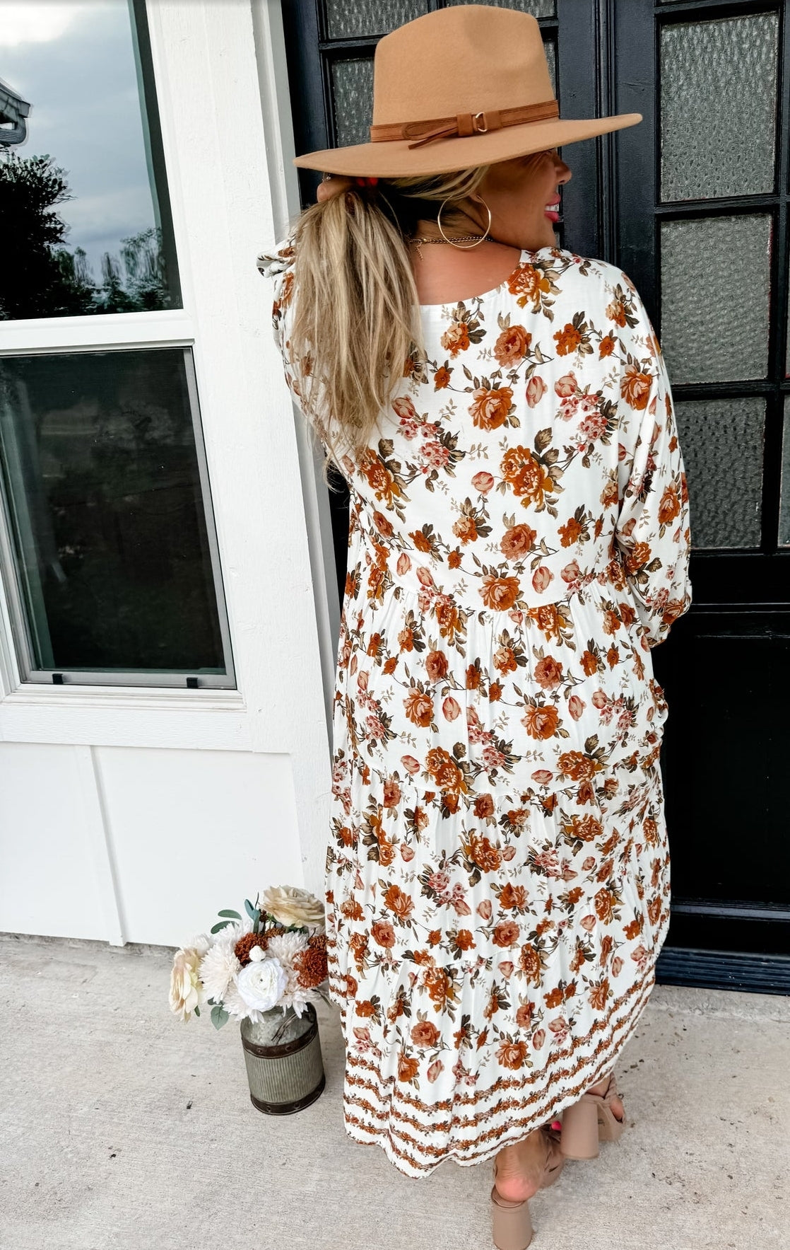A floral dress like this one is a must-have for the Fall season. Beautiful details featuring a split arm cuff and matching neck and hem floral pattern.