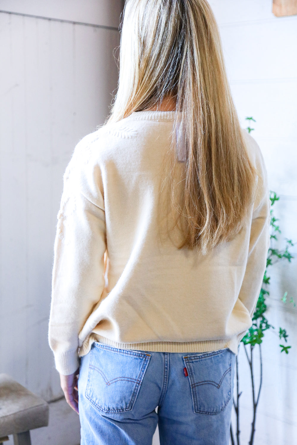 This sweater is such an easy go-to for cooler days. The soft, creamy beige color makes it super versatile — it pairs well with jeans, leggings, or even layered over a dress. What makes it special is the delicate embroidery along the shoulders and sleeves. It's subtle and really pretty up close.