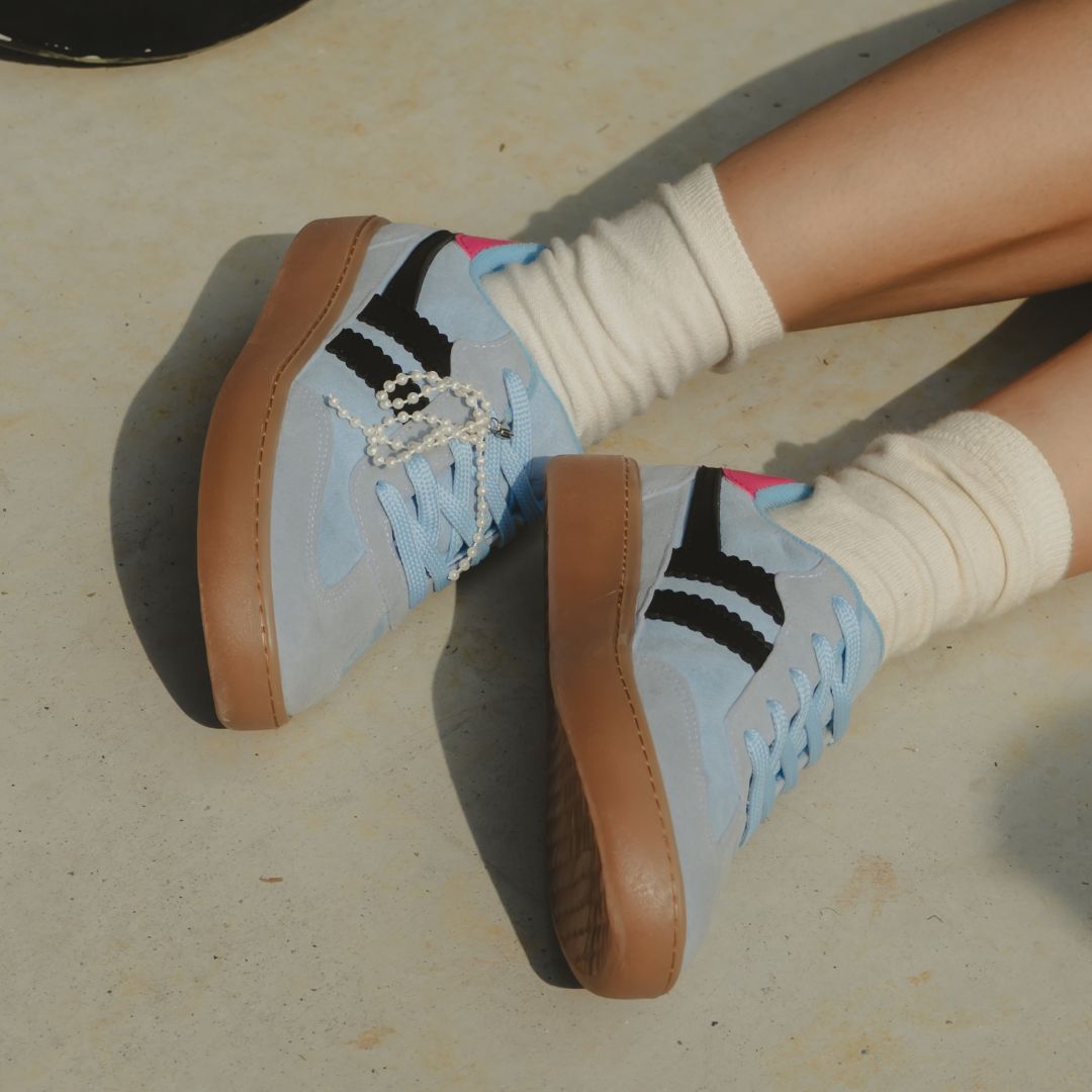 Introducing our stylish MIEL sneakers, designed for comfort and versatility. Crafted from high-quality materials, these sneakers have a sleek silhouette and a vibrant blue and red hue that adds a pop of color to any outfit. The cushioned insole provides excellent support, making them perfect for everyday wear or casual outings. Enhance your footwear collection with these modern sneakers that perfectly combine fashion and functionality. It features a bow detail designed with pearls for a touch of style and modernity.