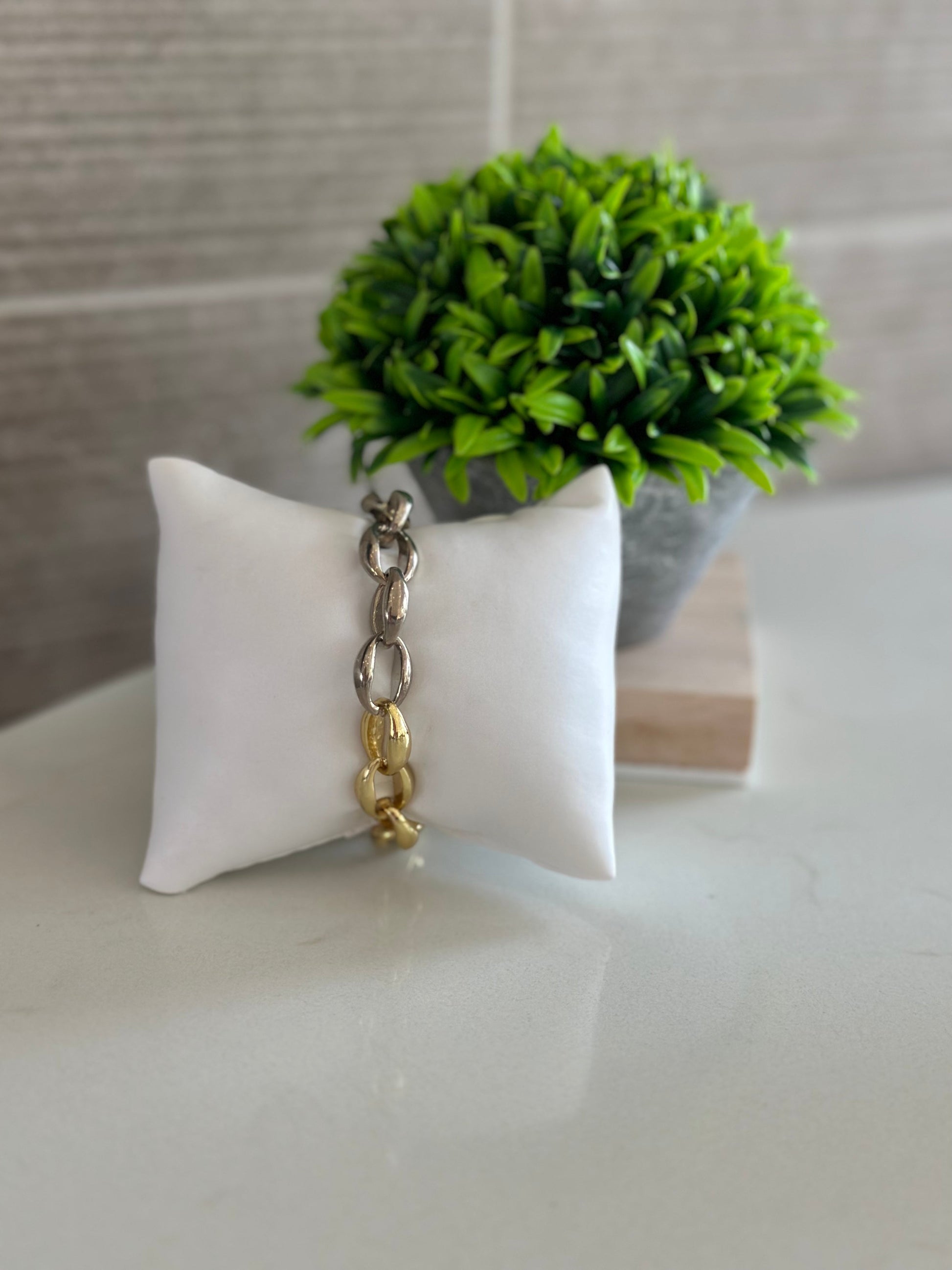 Introducing our Mixed Metals Toggle Bracelet, a stylish and versatile accessory that combines the timeless appeal of mixed metals with the convenience of a toggle closure. Crafted with precision and attention to detail, this bracelet features a combination of gold and silver links, creating a chic and modern look.