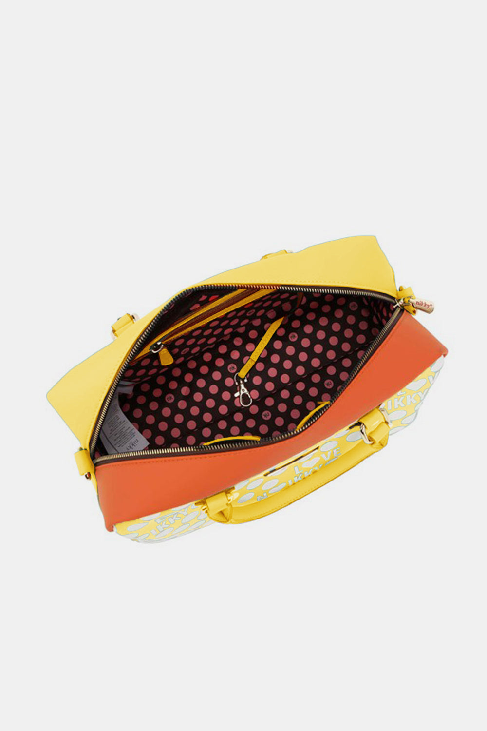 Large interior lined with signature Nikky polka dot print polyester fabric.