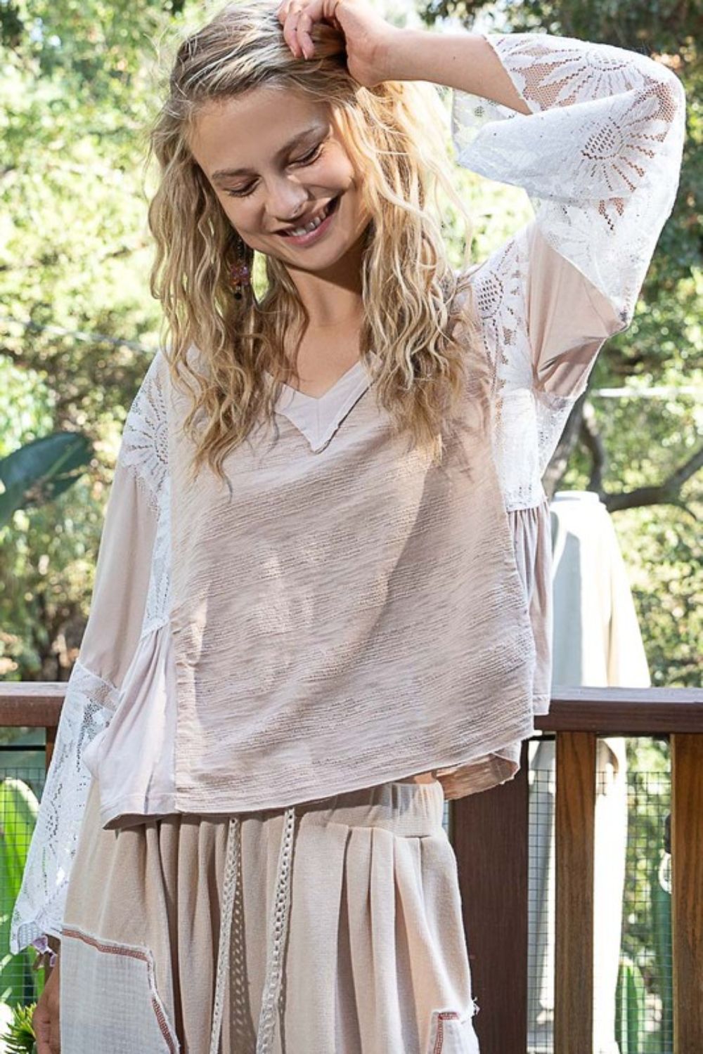 POL Lace Detail V-Neck Flare Sleeve Blouse