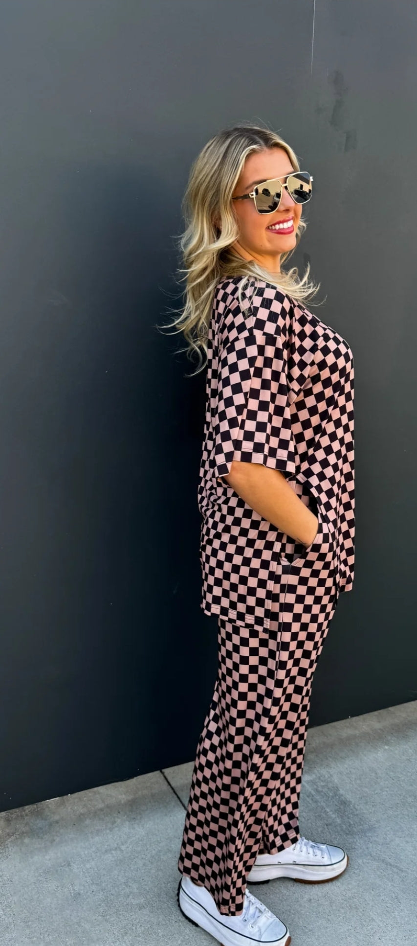 Cloud soft and so so stretchy! This bold checker top features an oversized fit with side slits. Matches perfectly with our bold block checker pants. Wear it as a set or alone with leggings or biker shorts! This Seasons staple "fit"!