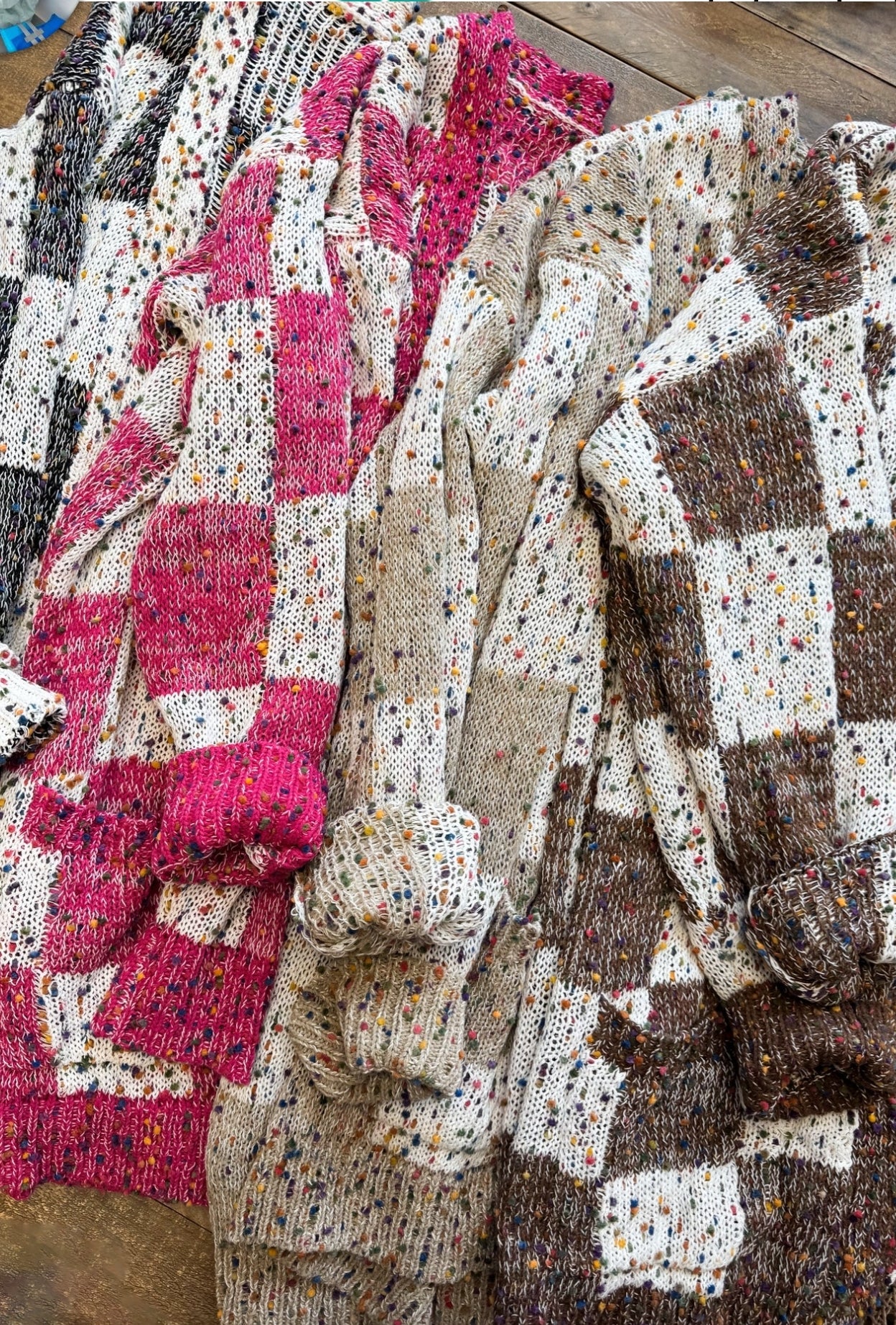 Our Miley Dot cardigan is BACK in a CHECKERED PATTERN design! We think it is SO cute and hope you do too!