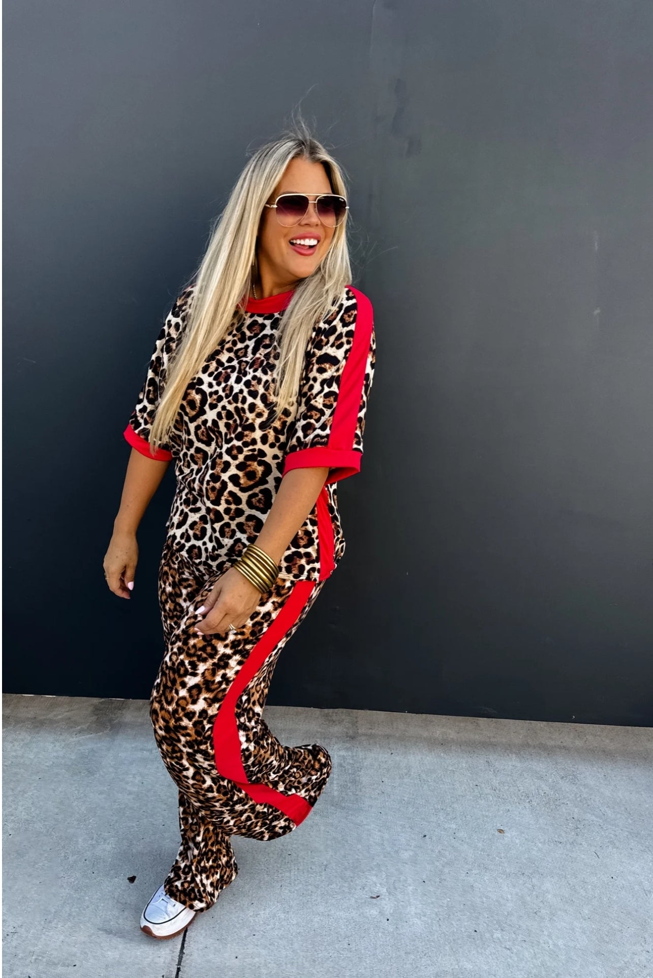 Introducing our trendy cheetah raglan style top featuring red trim details! Matches perfectly with our Wild Heart Cheetah Pants or looks adorable worn alone!