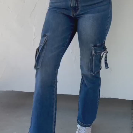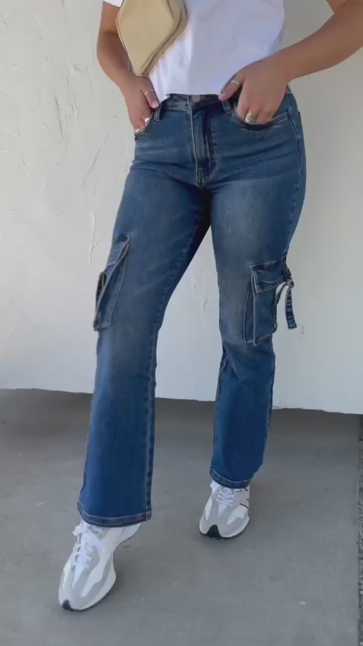 One of our favorite jeans of all time! These wide straight leg cargos have an easy fit that takes classic to a whole new level! Features a tailored bottom leg hem, side pockets and cargo pockets for a super flattering look! The stretch is amazing, but not TOO stretchy, so they hold their form after wearing all day!
