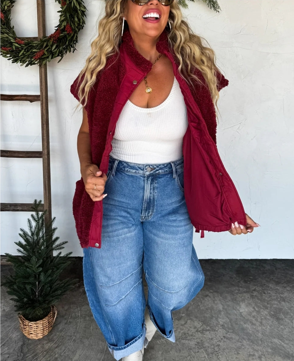 These stylish vests feature bold colors and prints in soft, plush faux fur sherpa, giving it a cozy and luxurious look. It has a high collar and longer cap sleeve design with snap button closures down the front. Also features side pockets and side tie strings for cinching or wearing shorter if preferred. Perfect for layering, it adds a fun, fashionable edge to any outfit.