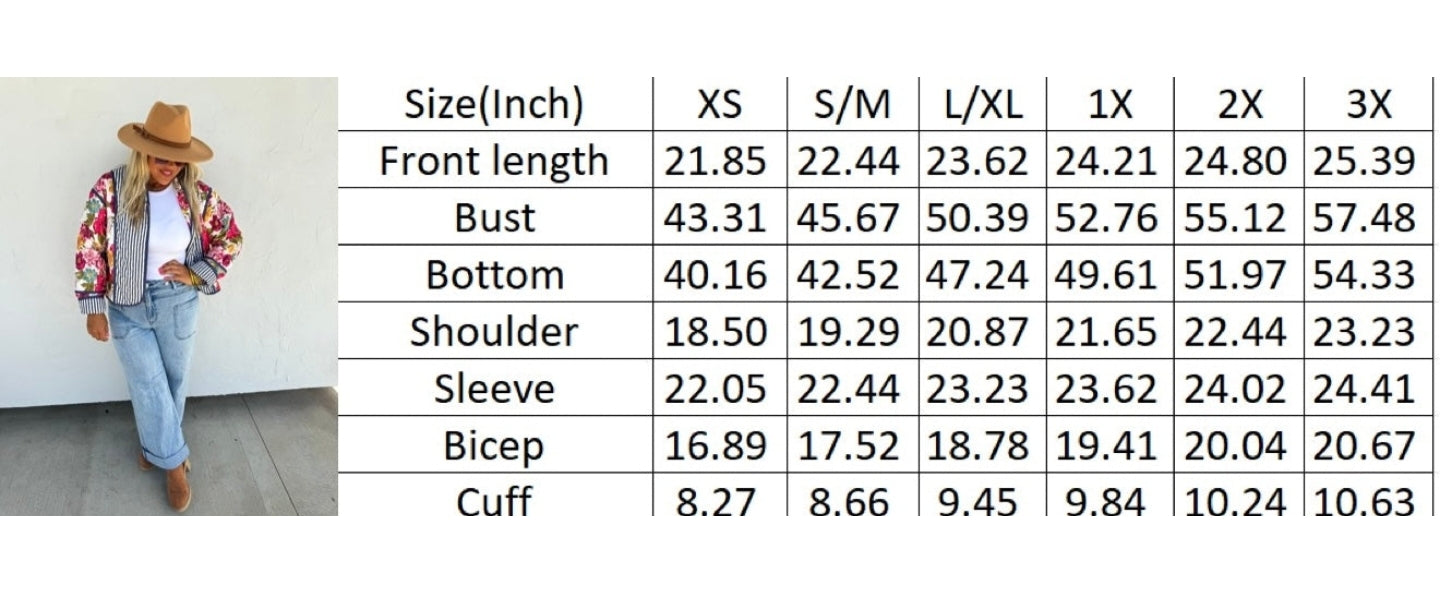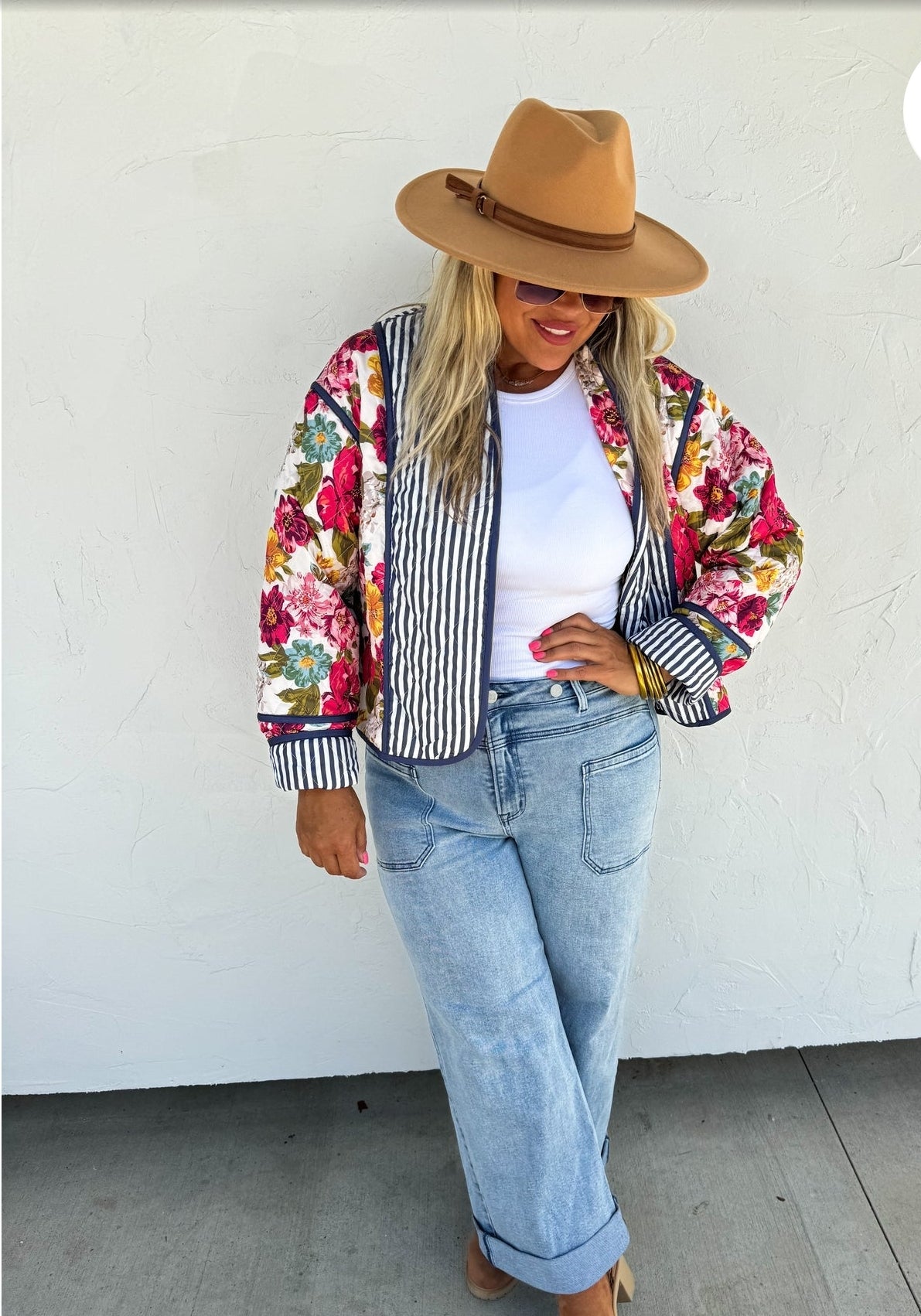 This quilted style jacket is this seasons trendiest jacket! The perfect mix of floral and stripes! Roll the sleeves for a fun match of stripes to the front, or leave them down for all floral look. This is a thinner style jacket-no side pockets.