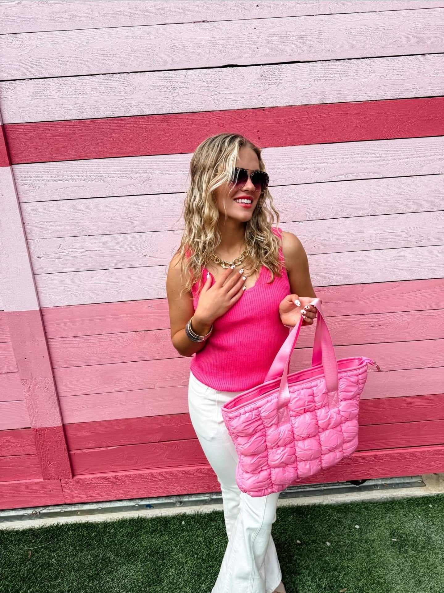 This high quality bag features the most trendy puffer/bubble style fabric. The perfect size to fit lots of things inside! Includes an inside pocket zipper with 2 smaller open pockets for cell phones and makeup. Bag also completely zips closed on top.