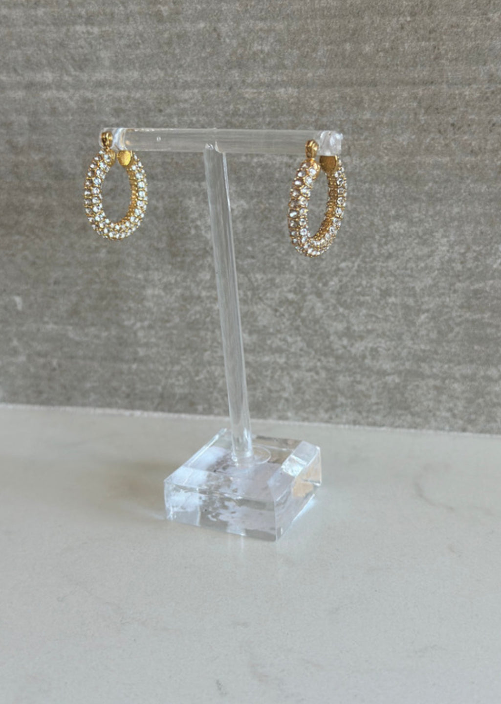 Small chunky gold, rhinestones all over hoops with clasp closure.