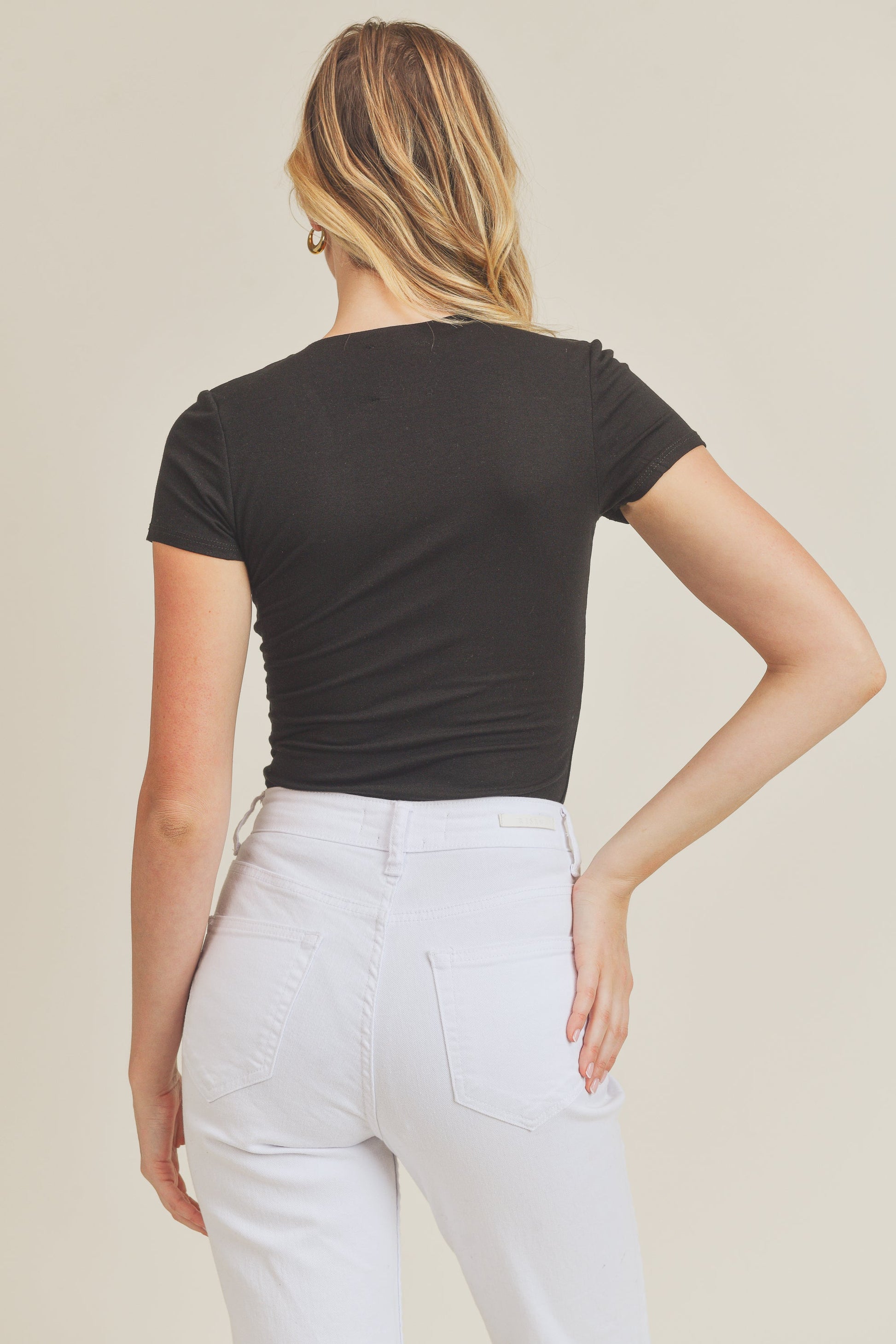 Short sleeve bodysuit with a deep v-neckline. Button snap closure.