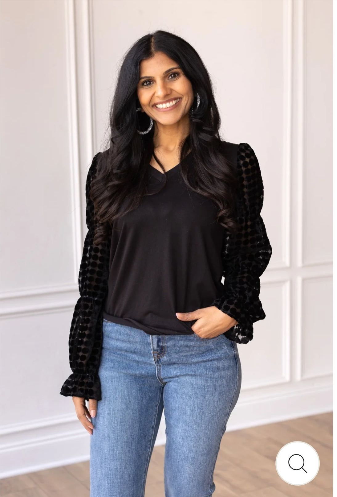 The elegant burnout velvet sleeves add a touch of luxury and texture to the classic black top. Whether you're heading to a special event, a night out with friends, or simply want to make a fashion statement, this top effortlessly enhances your look with a blend of elegance and style.
